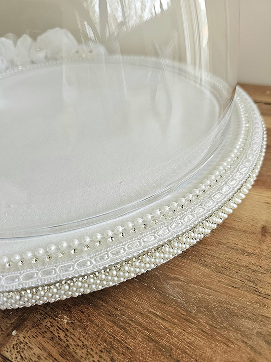 Η καμπάνα είναι γυάλινη, και στολισμένη με ένα λουλουδι μεγάλο με στρας και πέρλες δύο μικρά και φτεράκια.