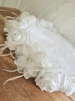 Η βάση της είναι ντυμένη με λευκό ύφασμα και στολισμένη με λουλούδια στολισμένα με στρας, φτερά, σειρές από πέρλες, στρας.