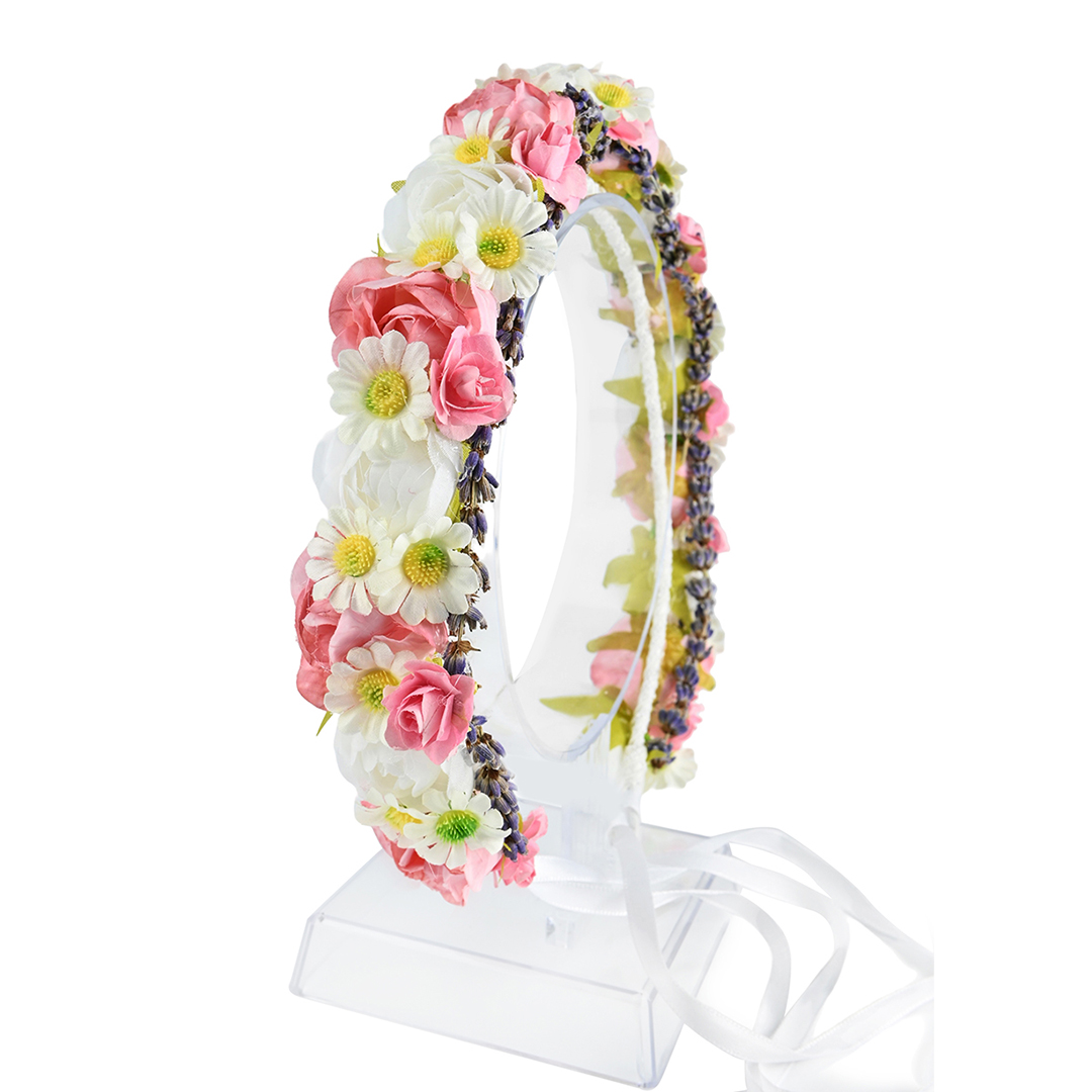 Είναι φτιαγμένο από υφασμάτινα ροζ λουλούδια, λευκά, χαμομήλια, και φυσικές λεβάντες.